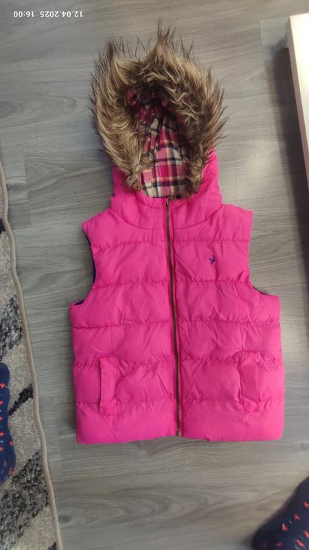 Жилетка для девочки на рост 152, сама жилетка целая в идеальном состоянии, карманы и подкладка тоже целая но на капюшоне есть белая полоска возможно ее можно постирать фото додаю