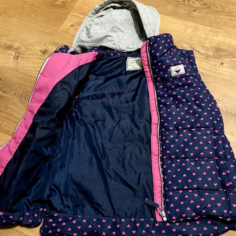 Темно-синя жилетка Next з милим візерунком сердечок — стильна й тепла. Розмір на 11–12 років (152 см), ширина 42 см, довжина 50 см. Дві кишені, капюшон на ґудзиках — знімний. Матеріал: 60% котон, 40% поліестер, підкладка — 100% бавовна. Стан ідеальний. Ідеальна для прохолодних днів і прогулянок з настроєм.