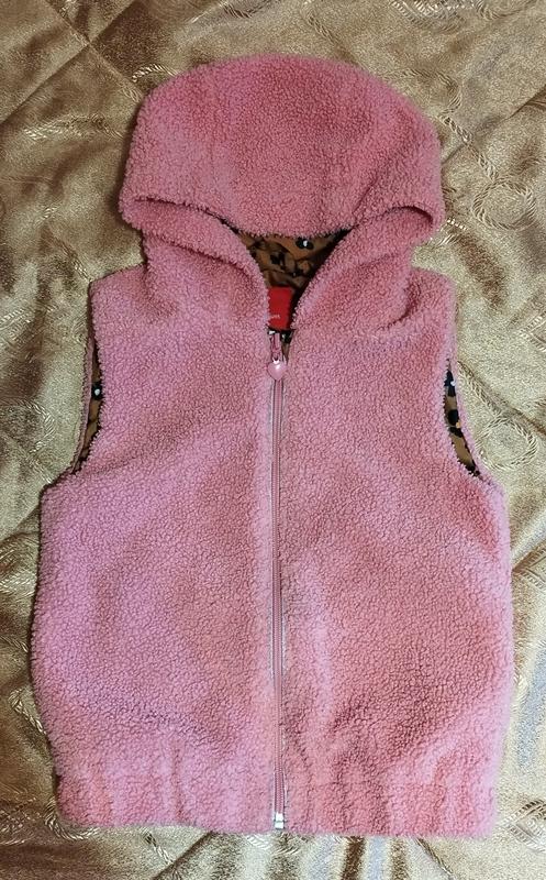 Тепленькая жилетка с капюшоном и кармашками. Красивый розовый цвет. Длина 45, пог 35 см. Рост указан 128, но лучше 122