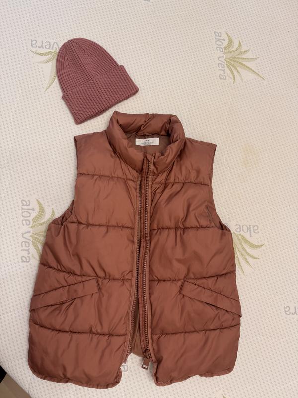 Чудові брендові речі, Жилет - 175 грн Шапка- 100 грн Заміри шапки на фото + добре тягнеться, стан нової Жилетка пуфер тип оверсайз 44 см ширина і 56 довжина по спинці