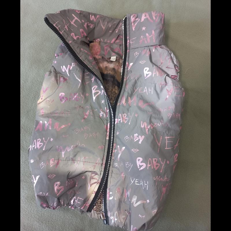 Жилетка на девочку 4-5 лет 110 см, утепленная, очень красивая, без дефектов, с светоотражающим эффектом серого цвета с розовыми надписями