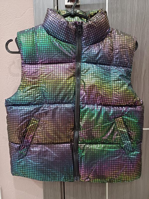 Новая жилетка для девочки, красиво переливается. Объемная модель, удобно надевать на теплые костюмы. Размер указан 140, но можно на 128-134. Длина от плеча 51 см, ширина под руками 46 см.