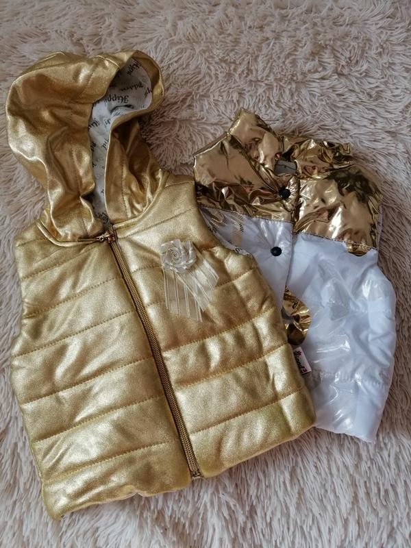 Крутые жилетки на осень, весну. Состояния новых, золотистая не носилась.Золотая с белым одевалась только для фото. 150грн одна. Эсли две отдам за 200.Размер 3-6мес.Примерно на рост 62-68см.