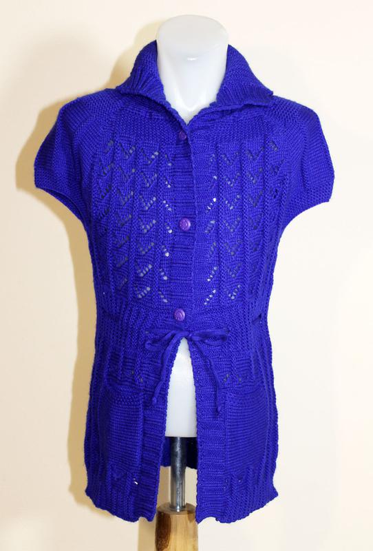 Жилет вязанный для девочки Вязаный жилет на пуговицах, с отложным воротником. Удлиненный фасон. Выполнен ажурной вязкой. Украшен накладными карманами Материал: акрил Цвет синий Размер 110-116