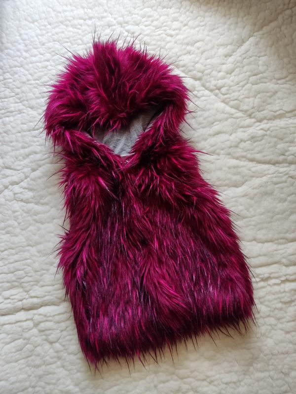 Яркая пушистая жилетка размер указан 4 года,104 рост, застёгивается на 4 кнопки ( трикотаж подклад) длина 37-40 см учитывая мех,пог 33-34 см