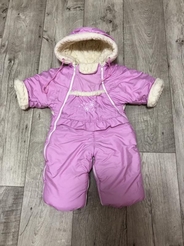 Дуже теплий комбінезон -конверт на зиму. Всередині повністю на овчині, буде тепло до -25 градусів. Для дівчинки до 80р включно, всі замки працюють, є невеликі потертості на замочку( фото в каруселі)