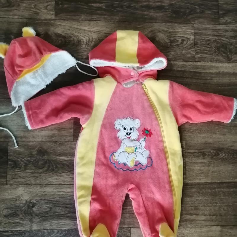 Детский комбинезон, идет с шапочкой, был в использовании несколько раз. Цвет: коралловый Размер : 62 см (0-3) Производитель: Турция