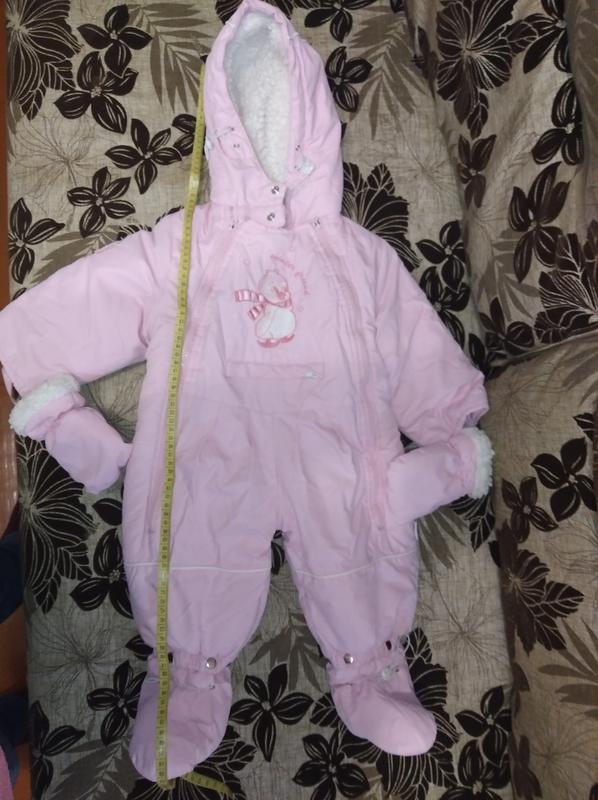 Зимний комбинезон на овчинке, очень теплый, размер 74 но мы носили дольше. Из недостатков: взломались "собачки" на молнии но все работает, просто можно заменить. На спинке есть прошитая резинка. Ножки остегиваются на кнопках. Отправка пока только укр.почт.