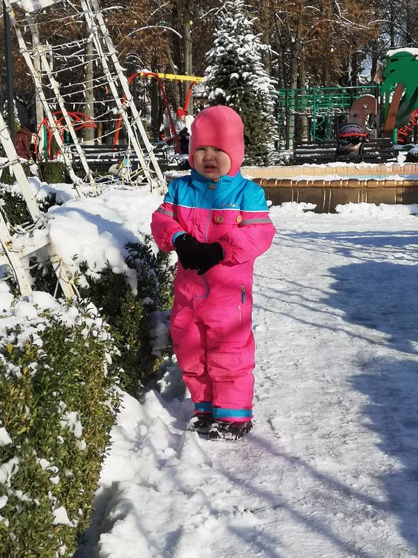 Замечательный зимний комбинезон, очень теплый. Капюшона нема. Комбинезон в целом в хорошем состоянии, чуточку потертые колени. Размер 3-4 года Длина 90 см, с манжетом 93 см, крок 39 см, рукав 37 см