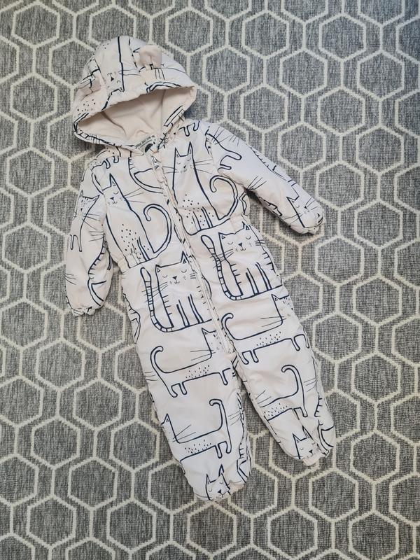 Очень красивый качественный деми комбинезон Next с котиками. Стан идеален. Как новый. Водоотталкивающая ткань, внутри на синтепоне и флисе. Очень удобный! Подойдет на холодную осень. Размер 18-24 месяца на рост 92 см.