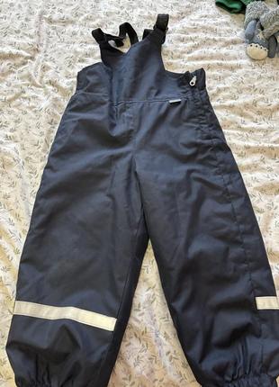 Теплые штаны на лямках с утепленной флисом спинкой. Снаружи идеально состояние, внутри есть потертости от сапожек. На рост до 110 на 4-5 лет . Длина шага 39 см, бедра 38 см