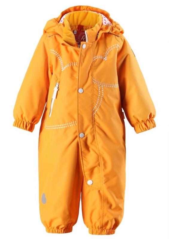 Reima комбинезон имеет среднюю степень утепления 160 g. Материал дышащий, ветронепродуваемый. Капюшон снимается. Проклеенные основные швы, седалище дополнительно утеплено. Спереди справа есть карман на молнии. Съемные эластичные штрипки на брючинах. Кнопки для крепления флисового комбинезона-подстежки. Наличие светоотражающих элементов обеспечивает безопасность в темное время суток. Материал, отталкивающий влагу и грязь. Цвет: оранжевый, подкладка с принтом Состав материалов: 100% PES (тканый), PU-нанесение Степень утепления: средняя (две снежинки) Для использования при более низких температурах рекомендуется флисовая подстежка соответственного размера. Состояние хорошее , дефектов нет, Размер 80-86 см. Очень просторный и удобный не сковывающий движений. Носился один сезон.