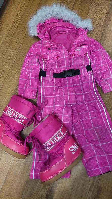 комбинезон для девочки лыжный Rossi. Капюшон и мех отстегиваются, Побокам карманы замка. Комбинезон под поясок, замеры: Довжина 73 см, крок 32 см, бедра 33 см, рукав 32 см.