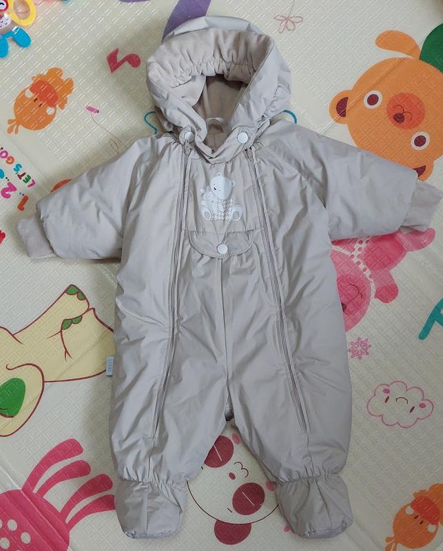 Зимний комбинезон, унисекс. 68 размер, бежевого цвета. Недостатков нет, ручки закрываются, ножки закрыты. в середине хлопковая подкладка, снаружи из полистирола. Очень удобно что капюшон на резиночке, ребеночке не будет задать и будет тепло и уютно.