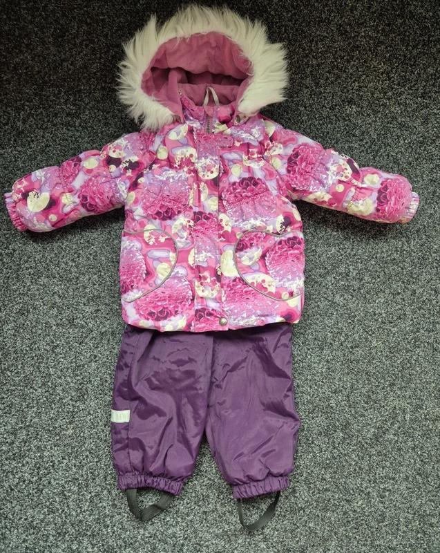 Комбінезон на дівчинку Lenne. Розмір 86.Стан ідеальний,окрім незначних дефектів які вказані на фото 5 та 6. Довжина куртки 42 Довжина рукава від горлового шва 39 см Довжина штанів 56 Довжина крокового шва 30 см