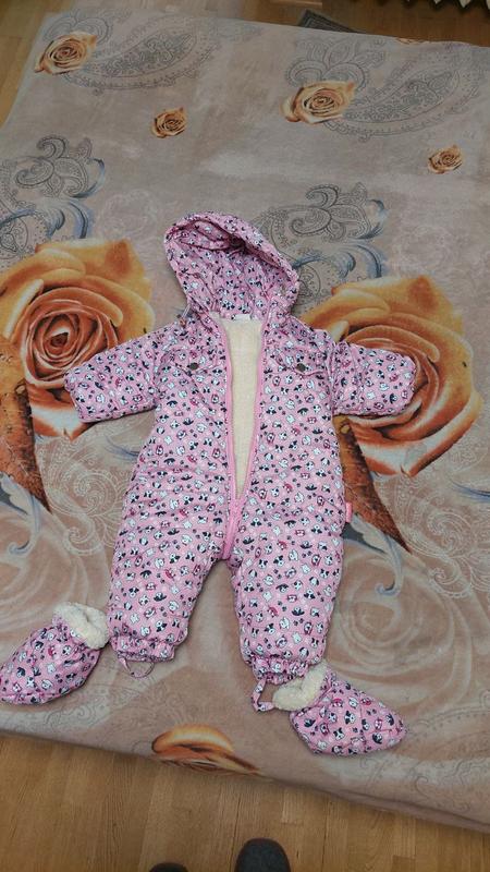 Замечательный зимний комбинезон для маленькой звездочки! очень легкий и теплый. Имеет теплые муфточки для ножек. Одевали когда имела езды в коляске еще, так что состояние идеальной без пятен и потертостей. Качество супер!