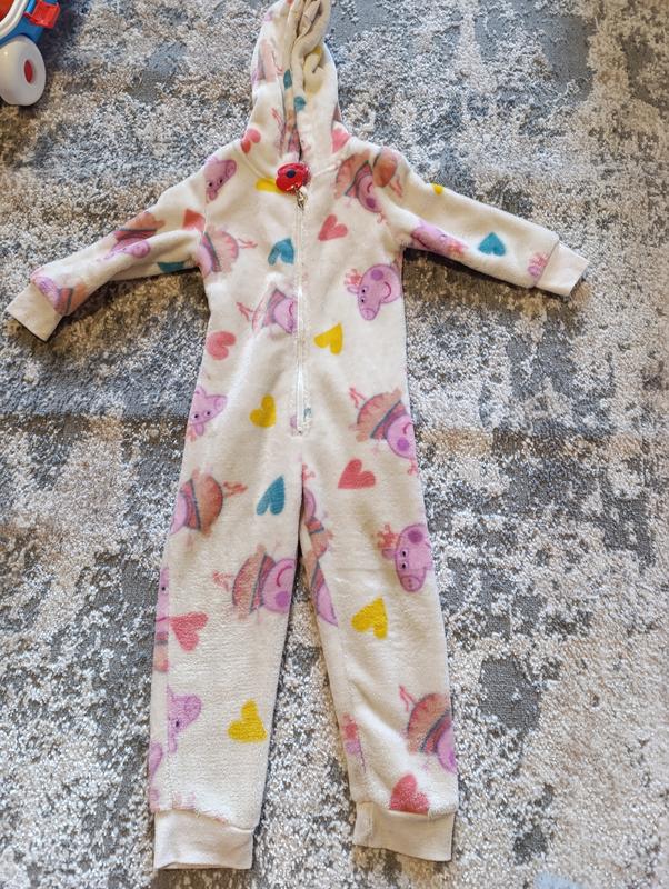 Peppa Pig (официальная лицензия) мягкий флис (очень теплый, приятный к телу) Размер: ~92-98 см (около 2-3 года) Длина от плеча до низа штанины: ~78 см Белый цвет с ярким принтом: Пеппа, сердечка, радуга Капюшон с ушками Удобные манжеты на рукавах и штанинах Красный декоративный элемент на молнии 👶 Идеально подходит для: Домашнего ношения Сну Прогулок в прохладную погоду (как верхний слой)