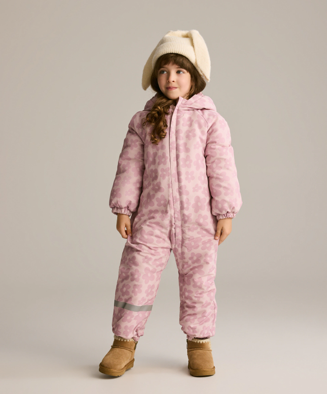 Большой мягкий капюшон Длинные рукава Застежка на молнию Манжеты на рукавах и штанинах на резинке Светоотражающие элементы Утепление в середине Функция waterproof Сплошной принт Размер в наличии 110.