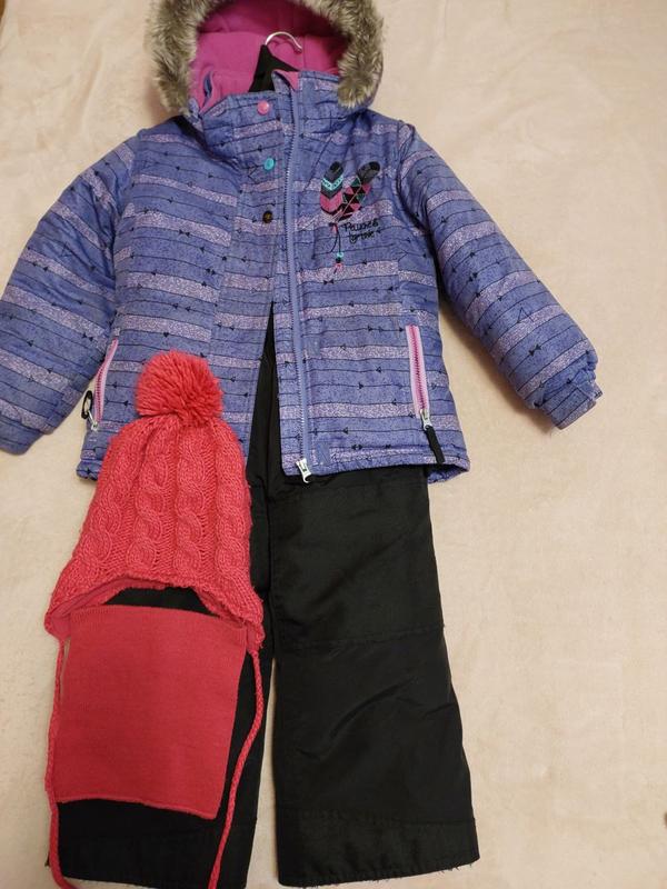 Зимний термокомбинезон ТМ PELUCHE & TARTINE для девочек 6-8 лет, шапка и снуд ТМ PELUCHE & TARTINE в подарок. В очень красивом состоянии, теплый и износостойкий. Заміри на фото. В Киеве возможен самовывиз. Куртка нежного лавандово-фиолетового цвета украшена вышивкой "пирачко". Флисовая подкладка такого-ж фиолетово-розового цвета. Пушистый серо-бежевый искусственный мех на капюшоне смотрится очень тепло и уютно. Полукомбинезон на бретельках универсального черного цвета. Термокомбинезон ТМ PELUCHE & TARTINE подходит как для повседневной городской жизни, так и для активного зимнего отдыха - лыжи, сноуборд, прогулки в лес. Комплектация: куртка, полукомбинезон на бретельках. ОСНОВНІ ХАРАКТЕРИСТИКИ: температурный режим: от +5°С до -30°С, мембрана 3000 мм, PU напыление с изнаночной стороны, утеплитель: 100% силиконизированный полиэстер ПОЛИФЕЛ, плотность утеплителя: грудь и спинка куртки – 300 гр, рукава и полукомбинезон – 260 гр, капюшон – 160 гр. КУРТКА: внутренний снегозащитный клапан с мембранным покрытием на кнопках по низу куртки флисовая подкладка на спине, рукава на резинке, ширина манжета регулируется липучкой, на молнии есть флисовая защита подбородка, капюшон очень удобной формы и покроя, отстегивается. НАПОЛНИТЕЛЬБЕНЕЗОН: внутренний снегозащитный клапан с мембранным покрытием, флисовая подкладка в полукомбинезоне до середины бедра, нашивки из КОРДУРЫ в местах повышенного износа (цвета, низ брючин, задняя часть брючин), полукомбинезон частично закрывает спину и грудь, регулируемые по длине плечевые лямки в полукомбинезоне. Уход: При незначительных загрязнениях достаточно протереть ткань мягкой губкой. Рекомендуется стирать в стиральной обычными моющими средствами, не содержащими отбеливатели.