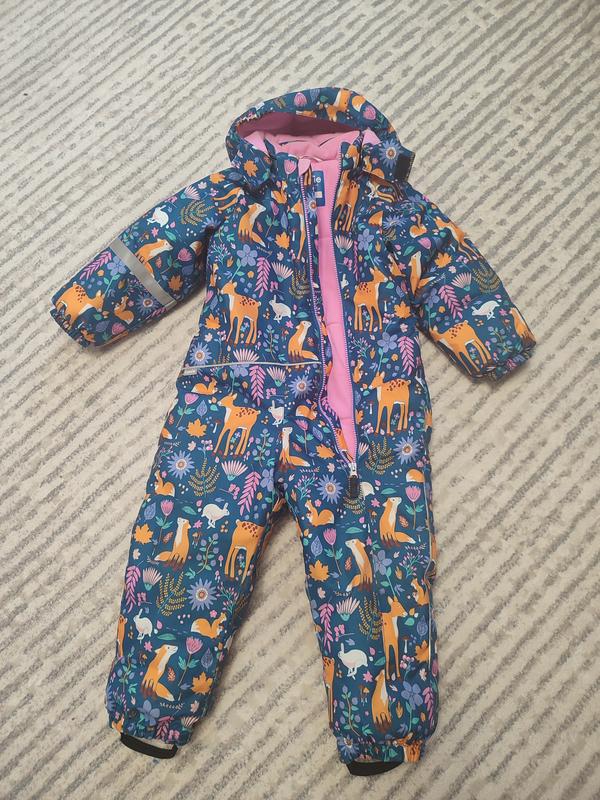 очень удобный зимний комбинезон. красивый принт. без существенных потертостей. они минимальны и незаметны. в подарок шапка и манишка