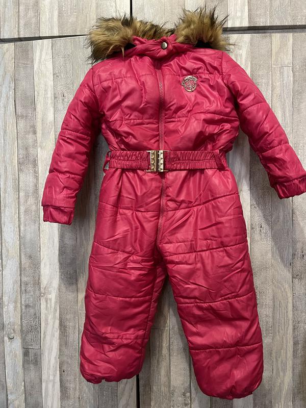 Яркий комбинезон для вашей малышки, носили с удовольствием! Всередине флисовая подкладка! Размер 104-110, но зависит от вашего ребёнка, мы носили и раньше( подкачивая) и по дольше! Длина 88, рукав 36, пог 37. Немножко гдето есть мелкие царапки, но в носке вовсе не видно! Могу збросить фото!