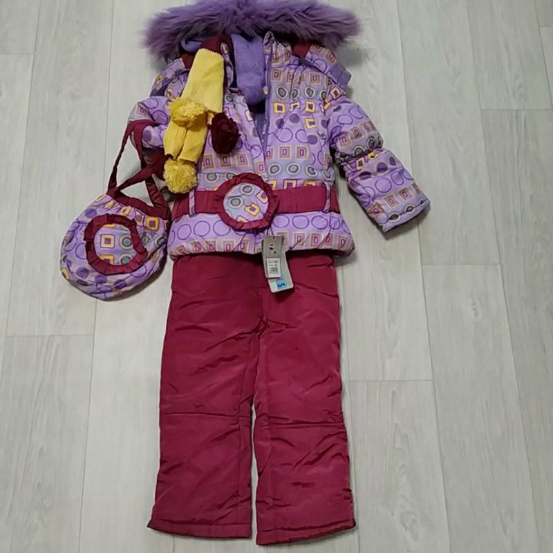 костюм отличного качества, много аксессуаров- жилет, шарф, сумка. Мех отстёгивается от капюшона, капюшон от куртки, жилет состегивается с курткой, можно все носить по отдельности. получается и демо и зима.Рукав на манжетах. Рекомендуемый размер92. Размеры : рукав 39 от плеча, 30 внутренний. длина 48, объем 34. брюки- от пояса 60, шаг 39, объем по бёдрам 36