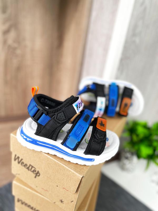 Яркие и стильные босоножки от TOM.M. Цвет: черный с синим. Верх текстиль. Фиксируются с помощью трех липучек, благодаря чему подойдут на любую ножку. Стелька кожаная с супинатором. Легенькі. Обожает такие модели - удобно стирать в машинке. 650 грн 23р. - 15,0см 25р. - 16,2см 28р. - 18,2см Измерение сделано по стельке от края до края лично мной, погрешность 1-2мм допустима.
