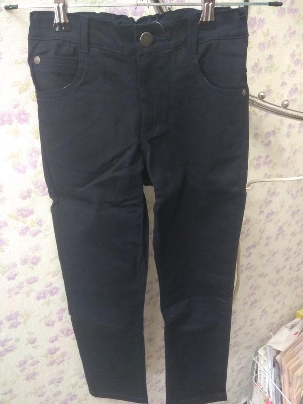 Якісні однотонні брюки на хлопчика темно-синього кольору, в талії регулюються резиночками, є кишеньки та лямки під поясок. Тканина типу під джинс,тянеться Розмір 122 Довжина 72см Шаговий 53см Бедра 34,5см Розмір 128 Довжина 75см Кроковий 55см ПО бедр (міряла під ширінкою) 35см Розмір 134 Довжина 77см Кроковий 56см ПО бедр (міряла під ширінкою) 37см