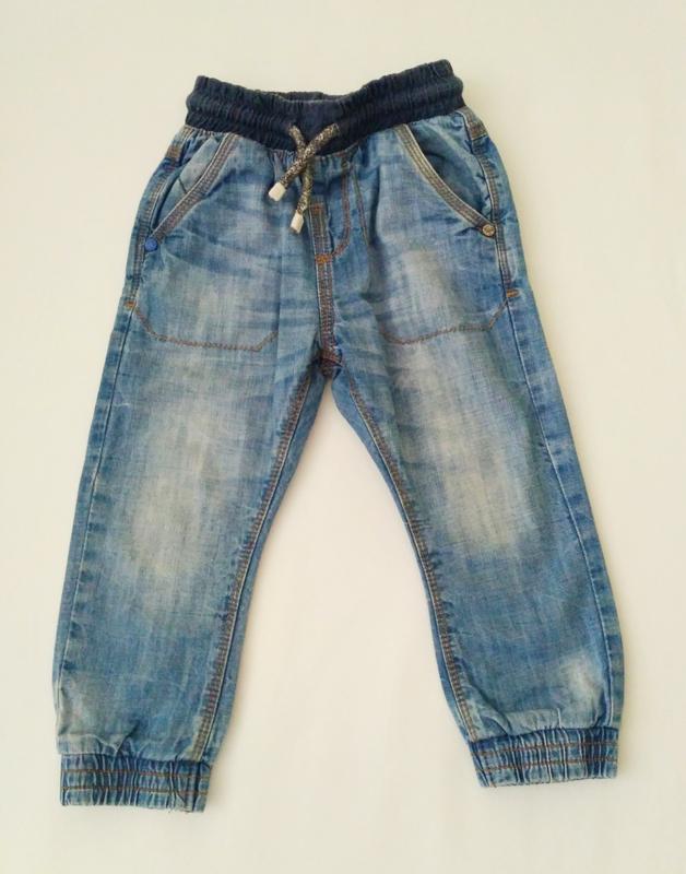 Джинсовые джоггеры Next в очень хорошем состоянии. Резинка на талии+ шнурок, резинки на штанинах. Спереди и сзади по два кармана. Без нюансов. Размер 1,5-2 года, рост 92 см Длина - 51 см, Пот - 20 см, тянется до 30 см Поб - 32 см Посадка - 19/25 см