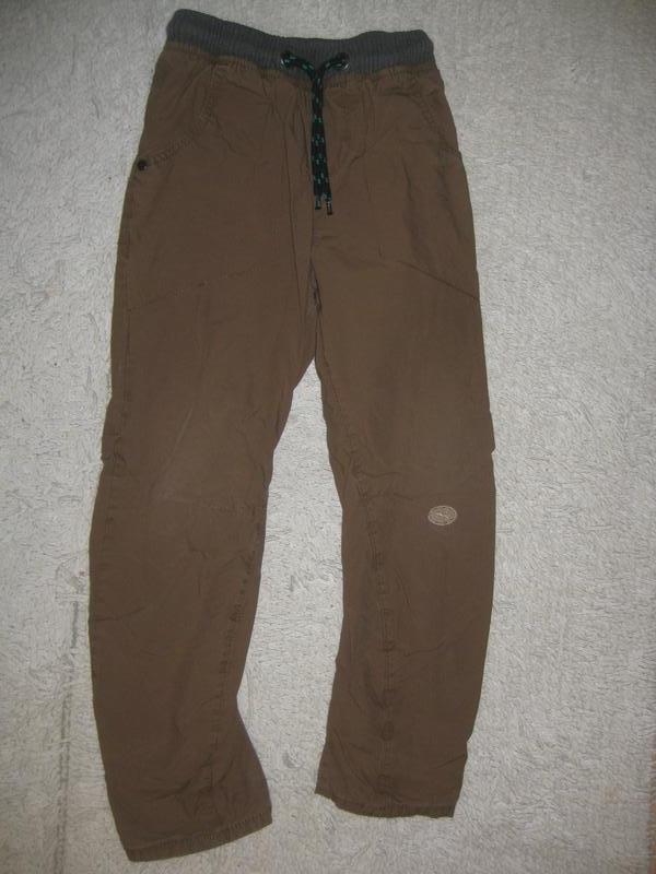 Штаны-скини NEXT на трикотажной подкладке на резинке и шнурке в талии, заужены к низу. Возраст 7 лет, рост 122-128 см. Материал вверха - 100% котон, подкладка 60% котон, 40% полиэстер. Цвет коричневый Состояние хорошее. На коленке был порез - сделала апликацию. Замеры: длина полная 73 см, шаговая 50 см, ширина в талии 25см + резинка, в бедрах 38 см. 60 грн