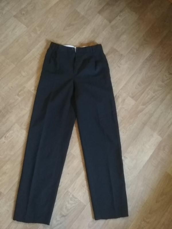 Черные школьные брюки из тонкой ткани, снизу оверлованы,но не подшиты.Длина без подгиба 95, ПОТ 30.
