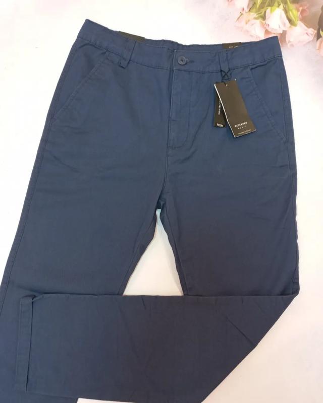 Дуже гарні брюки чіноси синього кольору. Ідеальні на святкову подію. Можна носити як з підворотом так і без. Регулюються по талії. Спереду 2 кишені, ззаду обманки. Заміри: довжина 95 см. пояс 37 см.
