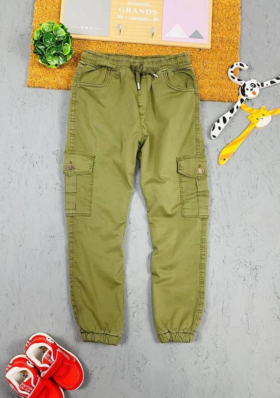 Брюки джогери на махрі тепленькі. Пояс зроблений на резинці і всередині вставлено шнурок для фіксації поясу. Попереду штани мають дві врізні кишені і по боках два накладних кишені, позаду два накладних кишені, внизу брюк є манжет на гумці. Утеплювач махра(травка). Виробництво: Туреччина 95% памук 5% еластан ХАКІ, Розміри р8(8-9)-3шт р9(9-10)-3шт р10(10-11)-3шт р11(11-12)-1шт р12(12-13)-2шт