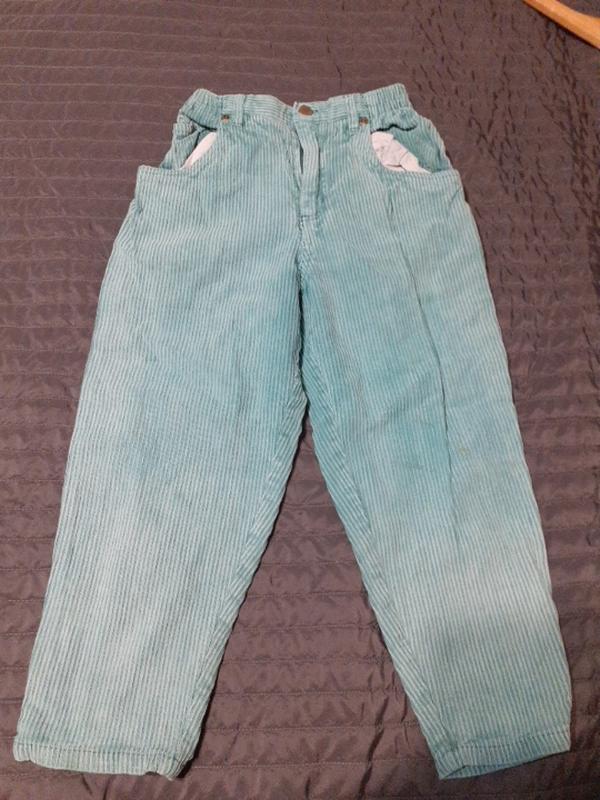 Вельветовые брюки для маленького модника. Цвет мяты. Два кармана спереди и сзади. Застежка молния и металлическая пуговица. В поясе сзади и в боках резинка. Есть недочеты, на фото показала. Поэтому такая цена. Длина по боковому шву 66 см, с учетом пояса, полуобхват талии 25 см, тянется до 32 см, полуобхват штанины по низу 11 см.