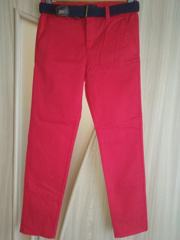 Стильні червоні брюки польської фірми TEX 140 розміру,з синім поясом,занижена талія,тканина дуже м'яка,приємна на дотик,два передніх і два задніх кармана,98%хлопок.По талії 32 см,довжина по зовнішньому шву 81 см,по внутрішньому 62см,ПОБ 39 см,ширина штаніни зверху 22 см.