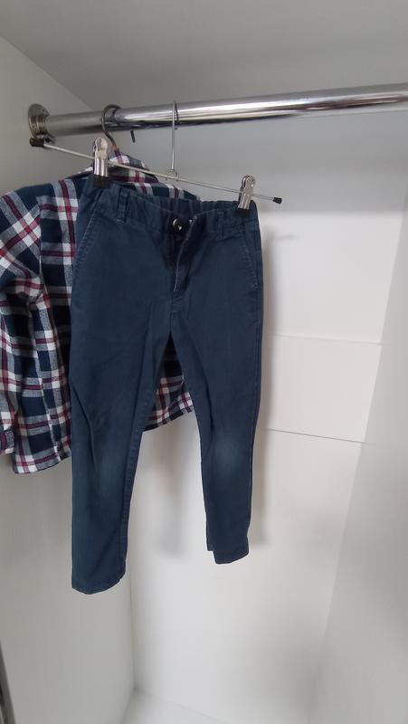 Брюки для хлопчика. Цвет темно синий, матовый. Размер указан 116 см. Длина спереди 62 см. Длина сзади 64 см. Трещи вытертые колени.