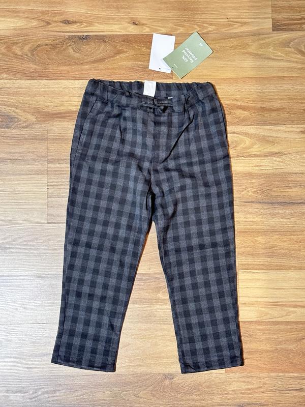 Новые брюки, возраст 2/3 года, рост 98 см. Вот 25 см регулируется резинкой, длина 54 см, об 32,5 см, состав. 34%, 65% полиэстр.