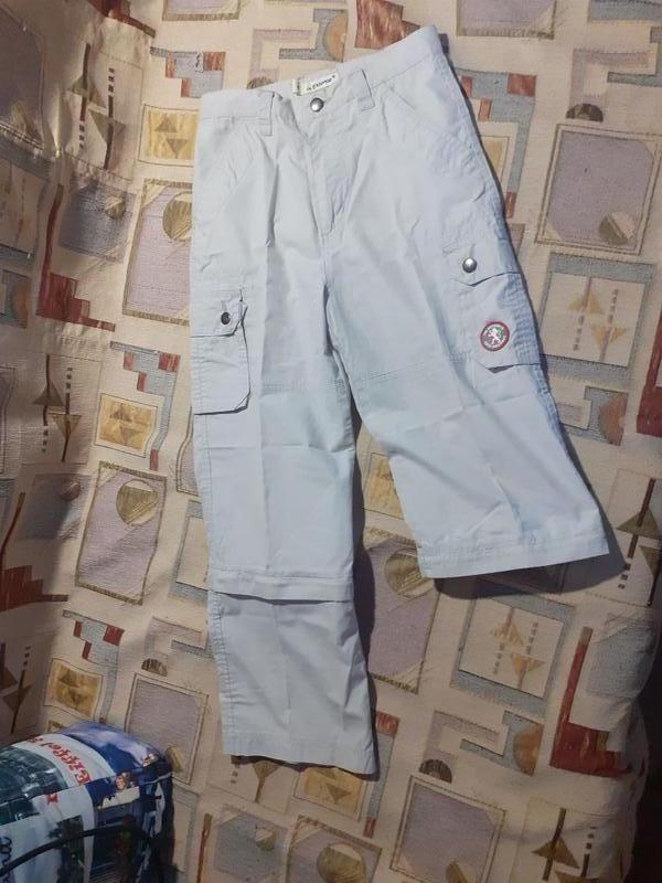Брюки-бриджы для мальчика. Состояние на фото. Нижняя часть штанины отстегивается. Мерки: Длина брючины с учетом пояса - 79 сантиметров. Если отстегнуть - 59 сантиметров. ПОТ : 30 Сантиметров. 65 % полиэстер , 35 хлопок