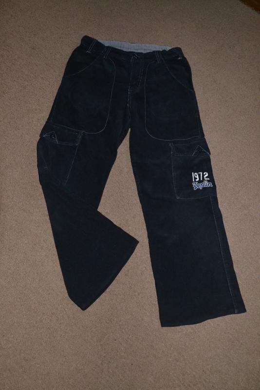 Черные вельветовые брюки фирмы Zeplin. Со множеством карманов. Длина по внешнему шву 82 см, по внутреннему шву - 60 см, ширина талии 33 см. В талии сзади на резинке.