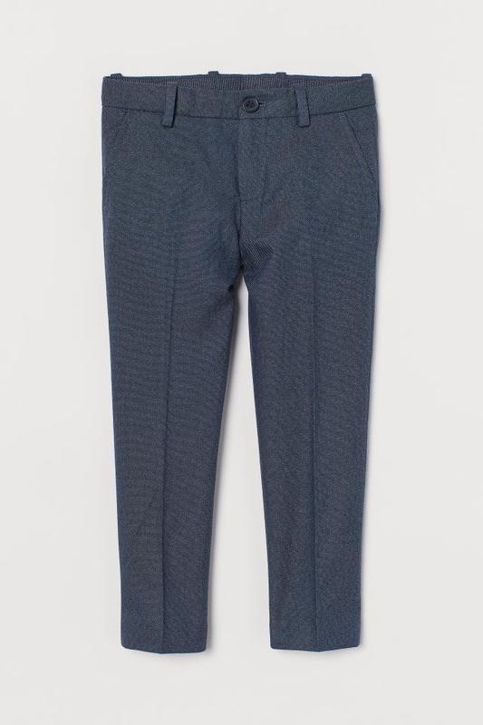 Костюмні брюки Slim Fit H&M Відмінна якість за відмінною ціною! Костюмні брюки з бавовняної тканини з бічними кишенями, а також помилковими кишенями з гудзиком ззаду. Регульована гумка на талії. Застібка на блискавку і гудзика. На брючинах запрасовані стрілки. Стан: новий з біркою. Склад: 100% бавовна. Колір: темно-синій меланж. Розміри в наявності: 128. 128: ПОТ 31,2 і є утяжка ПОБ 36,1 Довжина по боковому шву 74,5 Крокова 55,3