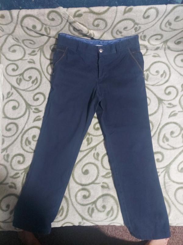 Брюки синего цвета. Состояние очень хорошее. На рост около 152см-158-164см. Замеры: пояс 36см, полу.ос-48см, длина 86см, длина внутреннего шва 63см, глубина посадки 28см. Спереди и сзади по 2 кармана. Выглядят очень стильно. Удобные.