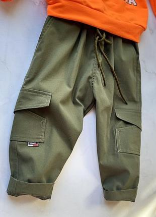 Брючки "Карго" Ціна 700 грн Розмір : 92,98,104,110,116 Склад: коттон Брючки мають 2 кишені ззаду, 2 функціональні кишені з боків та 2 кишені на колінах. Пояс на резинці та фіксується шнурком Колір хакі,чорний