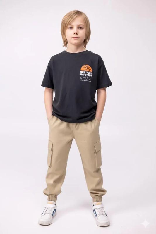 Штани-карго, штани-джогери дитячі на весняно-літній сезон. Тканина приємна до тіла , 100% бавовна. Кольори не маркі: темно сірий, хакі, чорний, темний беж. Кишені на талії прорізні, глибокі, вмісткі, зручні для особистих речей, ключів, телефону. Кишені бокові накладні на липучках, що також зручно при активному користуванні ними. Хлопчик 128см - штани 122р