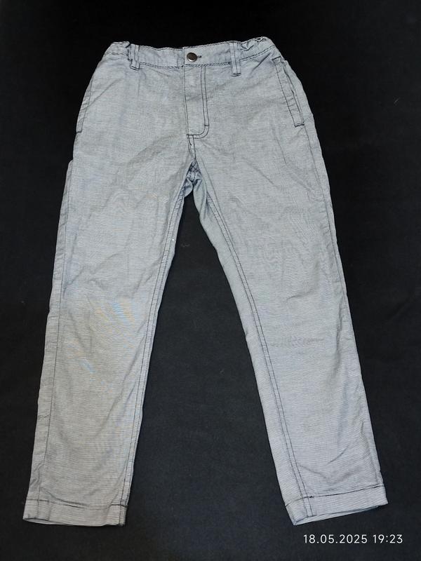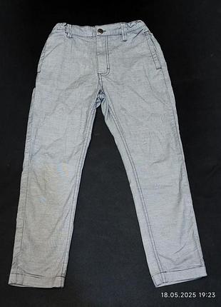 Качественные, стильные брюки серого цвета в отличном состоянии на ребёнка 7-8 лет. Полуобхват по поясу регулируется внутренней резинкой на пуговице и максимально тянется до 33 см, высота посадки 22 см, длина по внутреннему шву штанины 54 см, длина по внешнему шву штанины 74 см. Ткань 98% хлопок 2% эластан. Ткань немного тянется. Модель 6181