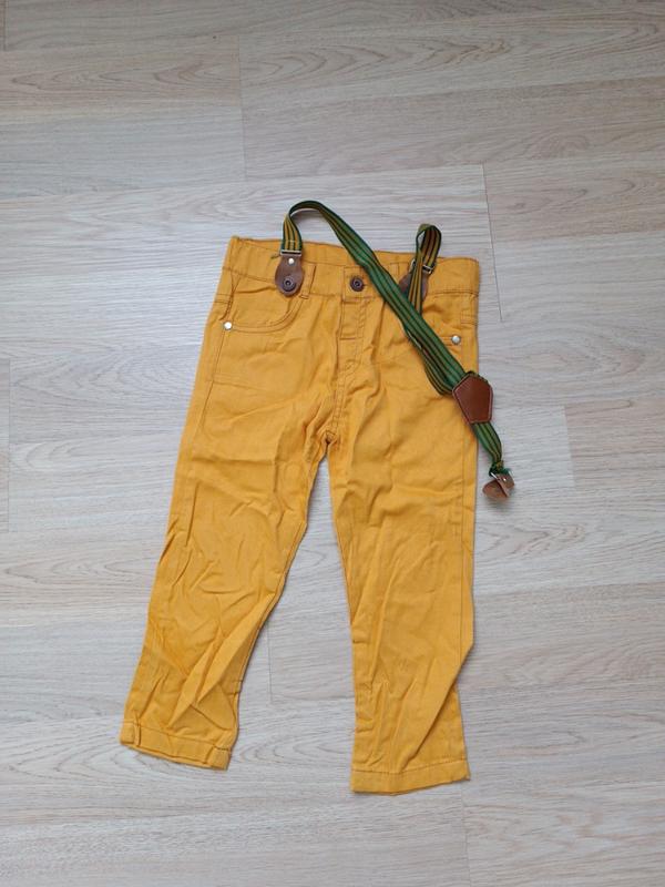 Брюки детские с подтяжками в комплекте. Длина 56 см, в поясе 28 см, шаг 36 см.