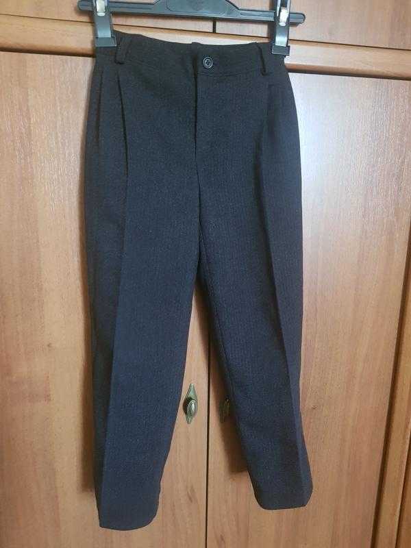 Брюки темносерые в мелкую полоску из костюмной ткани. Длина 72см, ПОТ 28см, низ штанины 18.5см. Надеваются пару раз.