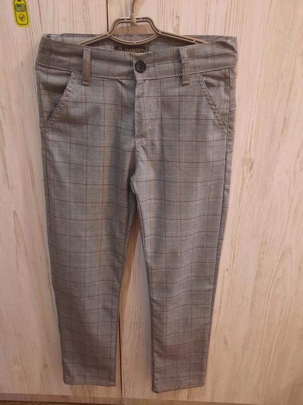 Очень красивые и стильные брюки на мальчика, как новые, одеты 1 раз, коттон, тоненькие, хорошего качества. На талии есть резиночки и пуговицы. Есть петельки для ремешка. Длина 78 см талия 31см без использования резинок, можно сделать меньше, если нужно. Шаг 56см