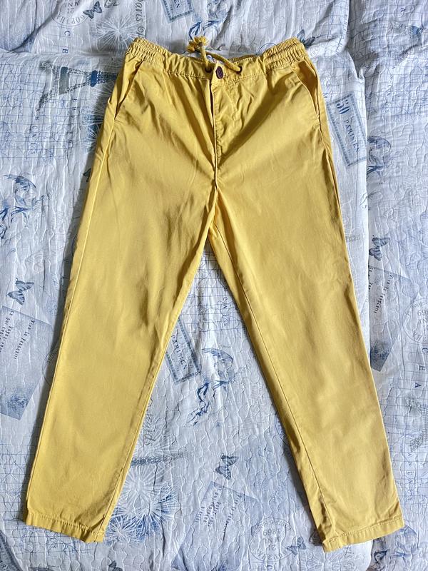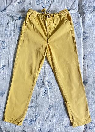 Легкі брюки на резинці (всередині є шнурок для регулювання обʼєму), застібаються на ґудзик. 100% котон. Є кишені. Майже не носили. Заміри: ПОТ 38см, довжина - 76 см, крок - 53 см.
