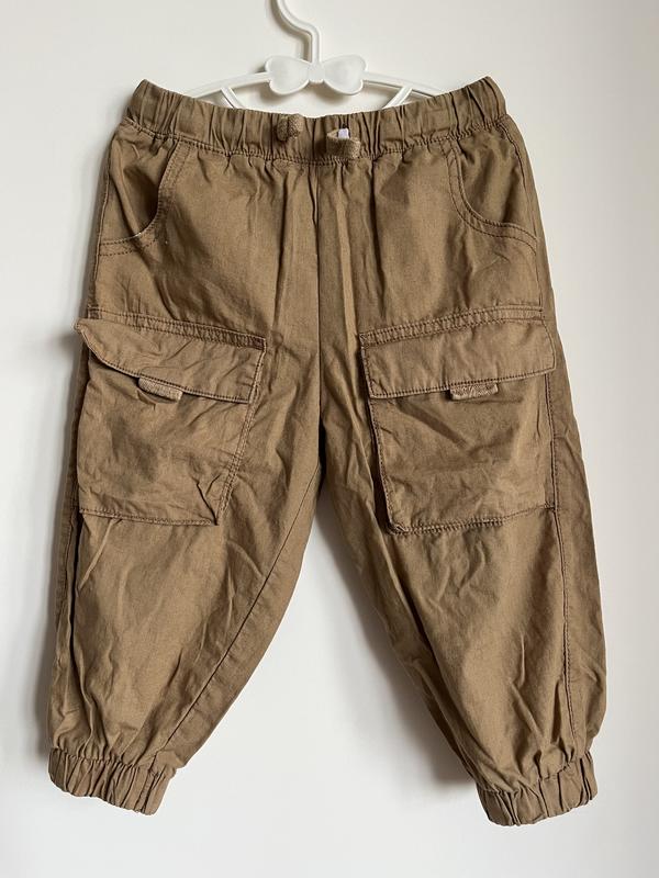 Літні штанці карго з тонкої бавовняної тканини з великими накладними кишенями, в поясі затяжки, манжети резинки. З нюансів - трохи затерта попа. Заміри на фото