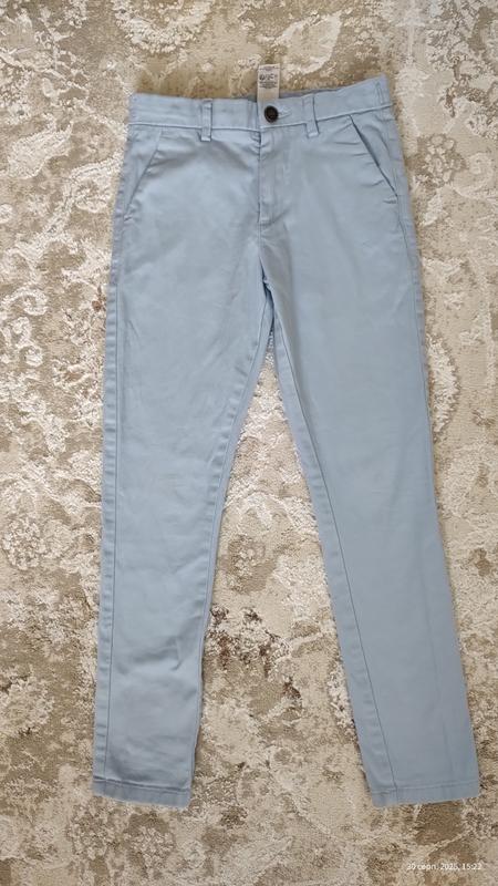 Зауженный крой, нежного голубого цвета, плотная ткань. В идеальном состоянии, без нюансов, одевали 2 раза в помещение.